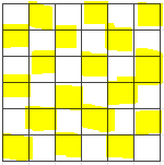 하지만 가장 작은 점을 아무거나 고르면 안 된다. 여기서 지점을 i, j (0 <= i <= r, 0 <= j <= c)라고 했을 때 i+j가 홀수인 지점만 선택할 수 있다. 즉 아래와 같은 격자모양의 평면이 완성이 된다. 여기서 형광펜을 칠한 부분 중 한 점을 제외하고 모든 점을 방문하는 경로를 구성할 수 있지만, 칠하지 않은 부분 중 한 점을 제외하고 모든 점을 방문하는 경로는 구할 수 없다.