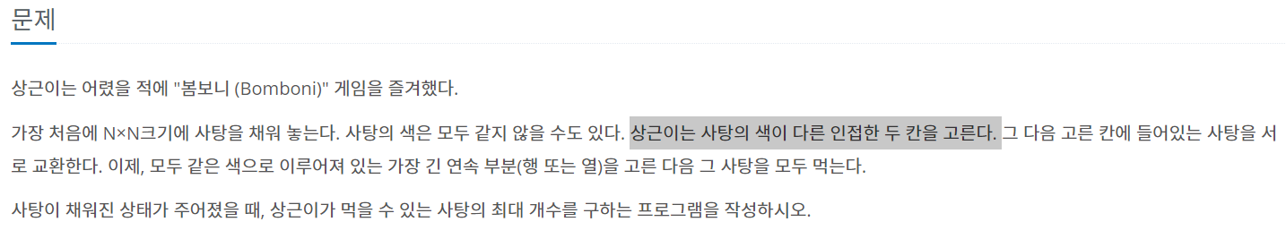 문제가 약간 헷갈리는데, 반드시 색이 다른 두 사탕이 인접한 칸이 하나 이상 존재한다. 하지만 반드시 색이 다른 두 칸을 교환하는 것은 아니다. 문제에는 다음과 같이 색이 다른 인접한 두 칸을 교환하는 것으로 나와있는데, 이렇게 하면 틀렸다고 나오니 같은 색이라도 교환할 수 있는 것으로 생각해야 한다.