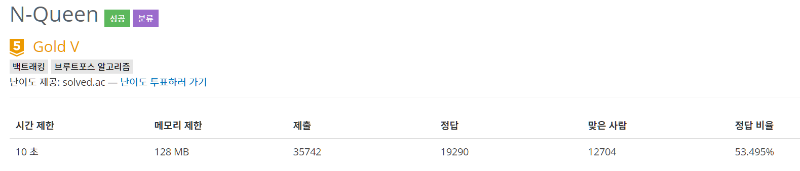 백트래킹 문제로 유명한 N-Queen 문제다. 유명한 문제인만큼 정답 비율은 53%가 넘음에도 불구하고 골드 5의 난이도를 갖고 있는 문제다. 그만큼 중요한 문제라고 말하는 것 같다.