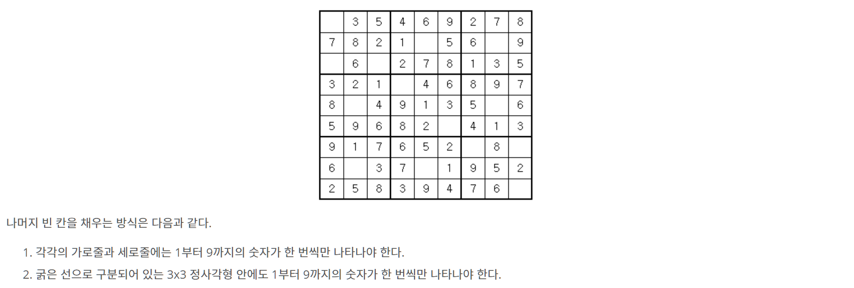 스도쿠는 18세기 스위스 수학자가 만든 '라틴 사각형'이랑 퍼즐에서 유래한 것으로 현재 많은 인기를 누리고 있다. 이 게임은 아래 그림과 같이 가로, 세로 각각 9개씩 총 81개의 작은 칸으로 이루