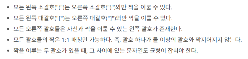 문제 세계는 균형이 잘 잡혀있어야 한다. 양과 음, 빛과 어둠 그리고 왼쪽 괄호와 오른쪽 괄호처럼 말이다. 정민이의 임무는 어떤 문자열이 주어졌을 때, 괄호들의 균형이 잘 맞춰져 있는지 판단하는 프로그램을 짜는 것이다. 문자열에 포함되는 괄호는 소괄호("()") 와 대괄호("[]")로 2종류이고, 문자열이 균형을 이루는 조건은 아래와 같다. 모든 왼쪽 소괄호("(")는 오른쪽 소괄호(")")와만 짝을 이룰 수 있다. 모든 왼쪽 대괄호("[")는 오른쪽 대