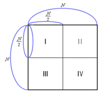보다시피 왼쪽 위 점에서부터 n/2 만큼씩 오른쪽과 아래로 되어있었기 때문에 I의 크기를 n/2 x n/2로 정하고 IV의 크기를 (n - n/2) x (n - n/2)로 정해서 풀었더니 맞았다고 나왔다.